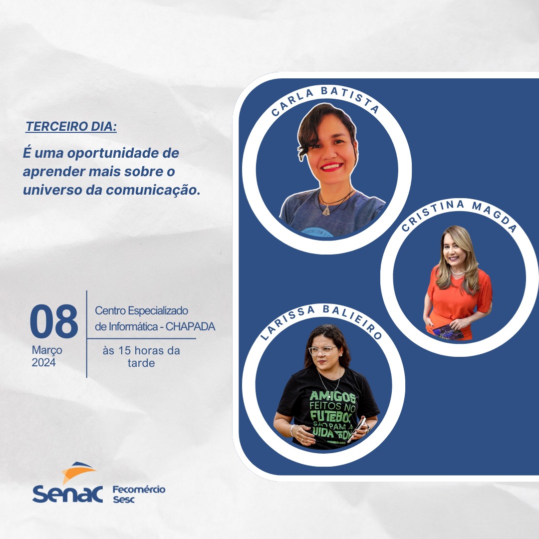 Na quarta dia 06 de Março iniciou no SENAC- Centro de informática, a primeira rodada de palestra- Rádio e Tv, com o tema geral: O mercado de trabalho e suas áreas de atuação e segue durante os dias 07 e 08 de março às 15H.