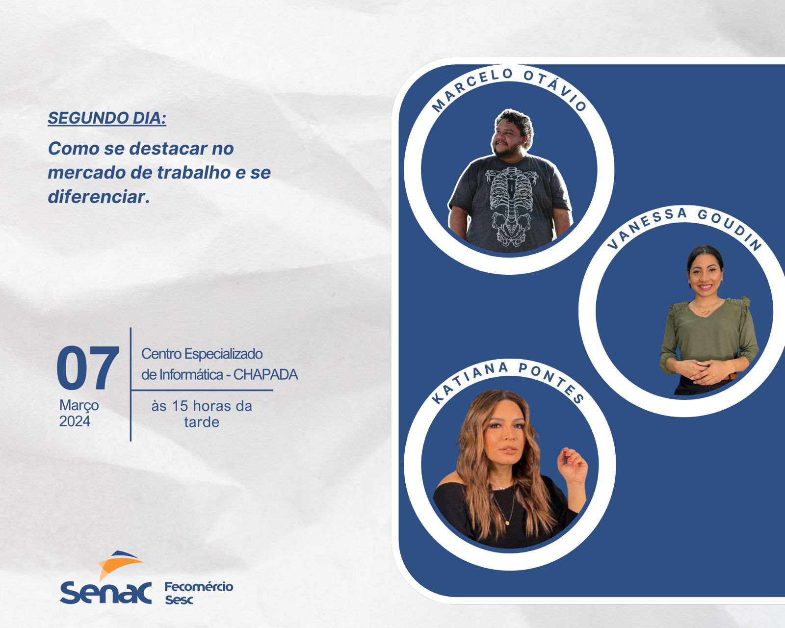 As palestras continuam durante os dois dias 07 e 08 desta semana à 15 horas, com mais convidados para agregar conhecimento aos alunos do SENAC. Segue abaixo o cronograma e os convidados do segundo e terceiro dia da rodada de palestras.